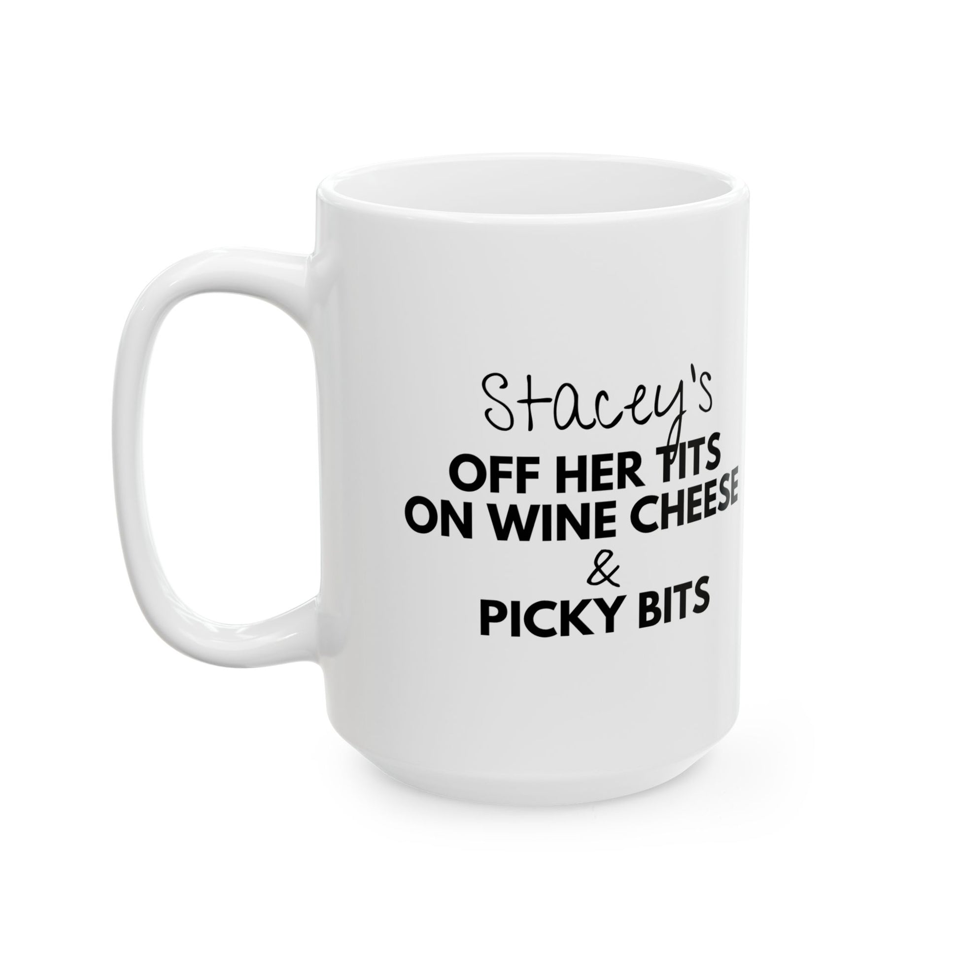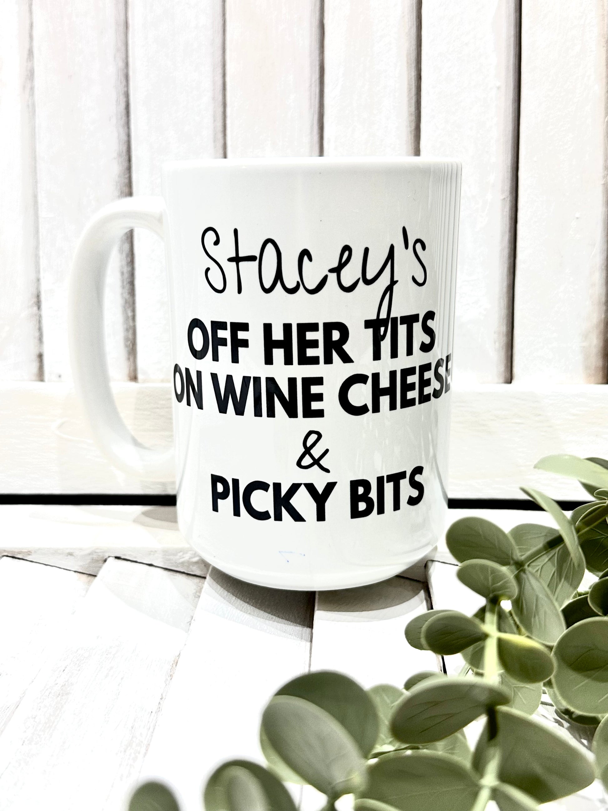 Personalised Off Her Tits on Wine, Cheese & Picky Bits Novelty Funny Mug