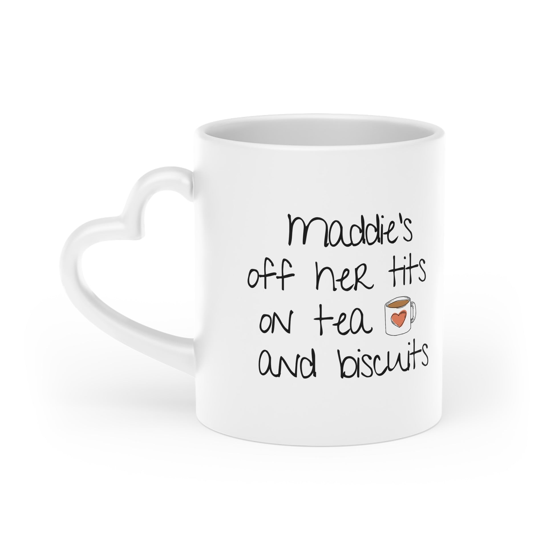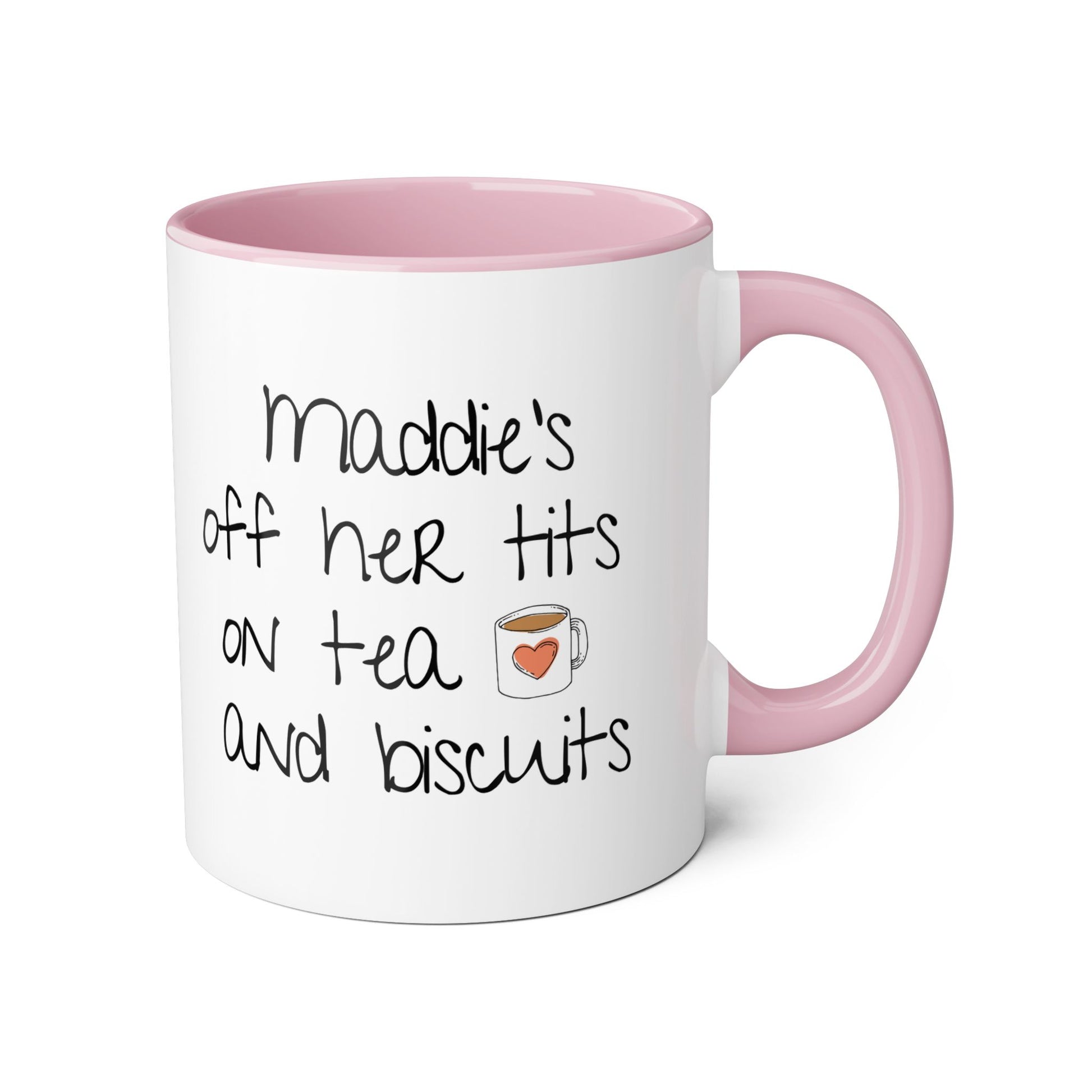 Personalised ' Off Her Tits, On Tea & Biscuits' Novelty Humour Mug